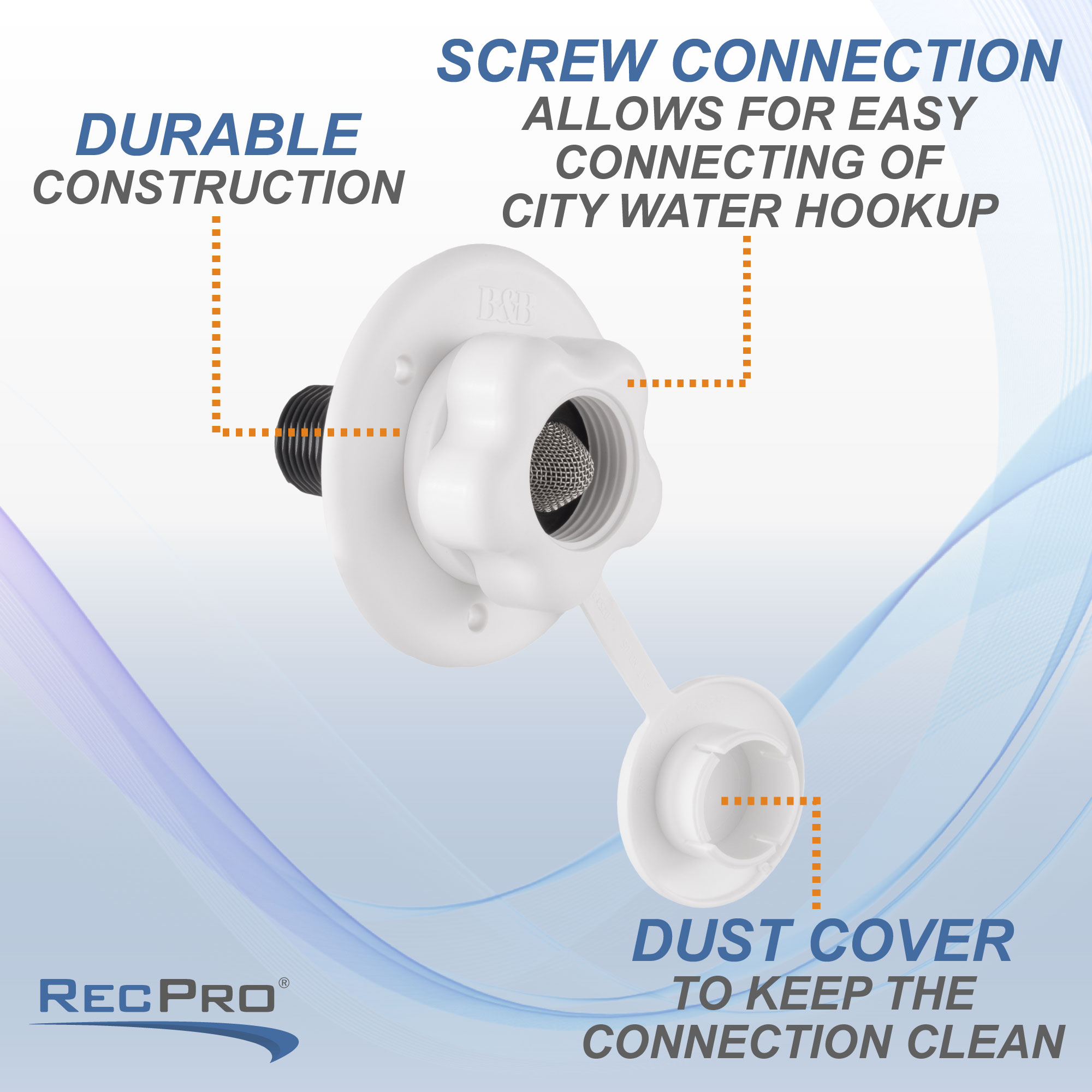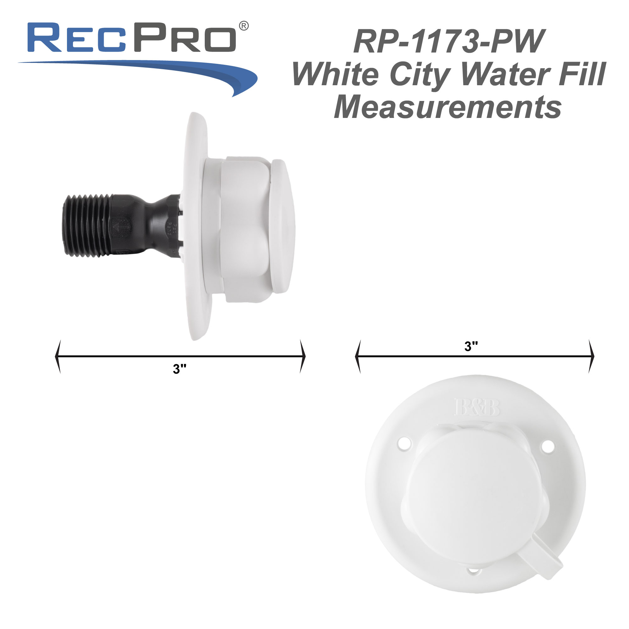 This city water fill measures a 3 inch circumference by 3 inches deep and connects to 1” threaded pipe on the outside, ¾” threaded pipe on the inside. The pipe threads are plastic and the flange is 3” in diameter. The outer pieces, which can be either black or white, are plastic in composition. Easy to install and use, it’s a terrific alternative to a brass city water fill.